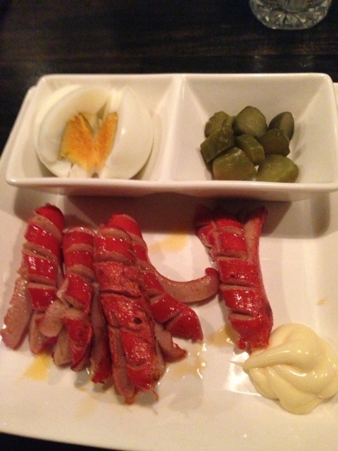 そんなことをつらつらしたためてると、三種盛登場。本来タコウインナーであるべきものは、横に包丁入れすぎて足の反り返りが出切れてないのはまあいいや。あとはゆで卵とピクルス。