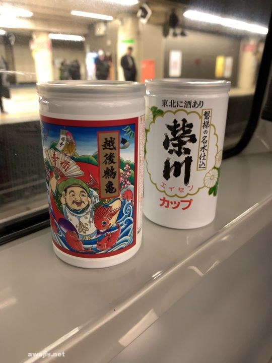 今宵の帰宅特急列車のお供は、新潟対福島の、この二本のアルミカップ酒。越後鶴亀はラベルは華やかで綺麗。味の軍配は栄川。