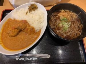ヨモダは400円の朝定食とは別に、フルサイズのよもだカレーと半たぬきのセットがあるんだぁ。ハーフはカレーのルーだけ、フルにはよく煮込まれたチキンのドラムスティックが入るわけね。