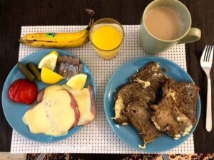 ライ麦パンじゃあまりおいしくはないだろうと予想しながらも、牛乳の消費のために敢行。珈琲もカフェオレ。ハムとチーズは焼いちゃいました。