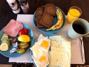 今朝は日本と同じように5時過ぎには目が覚め、日本と同じように、朝食準備。でも、ご飯炊いたり味噌汁作ったりではなく、ハム、チーズ、トマト、キュウリなど切って並べ、目玉焼きを焼いてパンをトーストするだけ。昨夜はつまみだった塩漬けニシンが、独特の風味のライ麦パンにマッチして美味い。