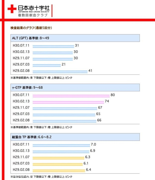 先日の献血の成分検査結果到着。γ-GTPの値が今年に入って上昇傾向。