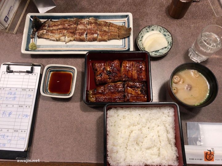 天文館の鰻屋で夕飯済ませてからチェックインすることに。天文館のバス停から歩いてすぐの、末よし。 二段の重で蒲焼と白ご飯が別に供されるスタイル。肝吸いではなく、肝の味噌汁。甘めの味噌がうまい。 せっかくなので、白焼きも。ああ、そこまでするなら、日本酒も。本当は焼酎行きたいが、それを自分に許したら、チェックイン後の仕事に差し障りが出るので我慢。 既に「白波」という注文にご当地のアクセントが聴こえていと嬉し。
