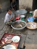 Thanh青年とひとしきり話し込んでから別れを告げて歩き始めたところ、すぐにメシ屋とおぼしき店があった。店の親族らしき女性たちが楽しそうに話をしながらテーブルを囲んでいる。思い切って入ってみたが、もちろん英語はまるで通じない。相当さび付いたベトナム語で「メシを食いたい」までは通じたものの、cha gioと注文してもまるで通じない。仕方なくショーケースの中の作り置きしてある料理を指差し注文する。すると、テーブルに座るようしぐさで勧められ、注文した料理を年季の入ったフライパンで温めて、ボール一杯のライスとnouc mamが入った小皿とともに持ってきてくれた。